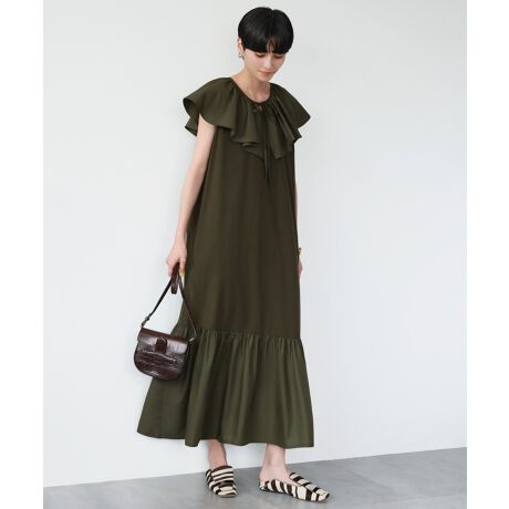 フリルカラー異素材ドッキングロングワンピース
