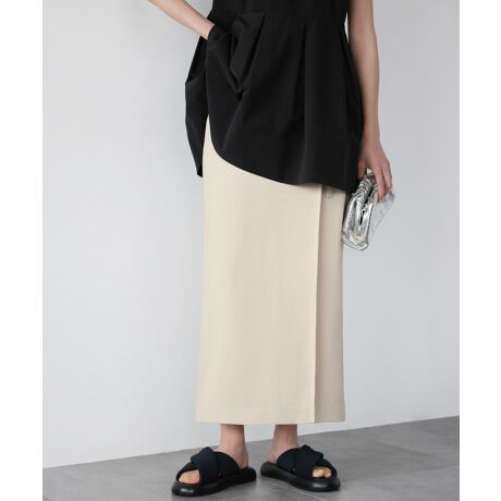 リネンライクな素材がシーズンムードを高める巻きスカート風ハイウエストタイトスカート。