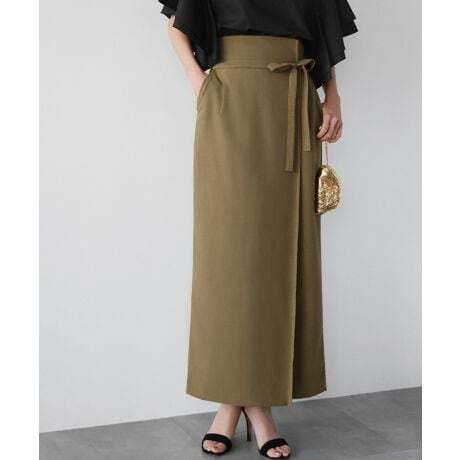 リネンライクな素材がシーズンムードを高める巻きスカート風ハイウエストタイトスカート。