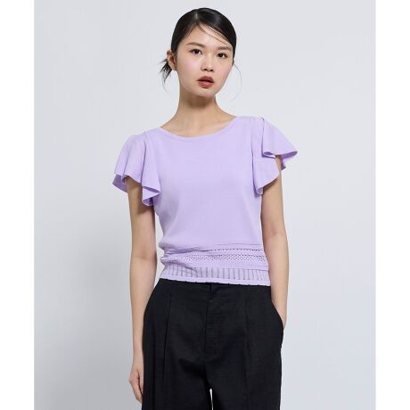 裾部分には透け感のある編みを切り替えで取り入れ、軽やかさと奥行きをプラス。単調になりがちなワントーンデザインに表情を与え、スタイリングにさりげないアクセントを添えています。袖は短め丈で、動きに合わせて揺れる柔らかなフリルが特徴。甘さを抑えた分量感がカジュアルにもきれいめにもなじむ仕上がりです。