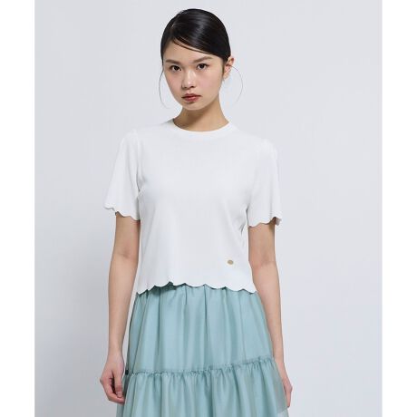 なめらかな表面感が美しいニットトップス。目の詰まった総針編みならではのフラットで上品な編み地が、シンプルながらも洗練された印象を与えます。程よく身体に沿うシルエットでラインを拾いすぎず、きれいな見え方を叶えます。衿元は詰まりすぎない開きで、顔まわりをすっきりと演出し、上品さと着やすさを両立しています。袖口と裾にはスカラップ風のカッティングを施し、さりげない甘さと女性らしさをプラス。シンプルな中にもデザイン性のある一枚に仕上げました。裾にはゴールドのTOCCAロゴプレートを配し、ブランドらしい品格を添えています。コンパクトな着丈で、スカートにもパンツにもバランスよく合わせやすく、ジャケットやカーディガンのインナーとしても活躍。オン・オフ問わず幅広いスタイリングに対応できるニットトップスです。
