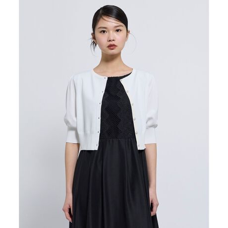 前立てと襟ぐりには、きらっとした表情のラメプレーティング糸を使用し、控えめながらも上質感のあるアクセントをプラス。主張しすぎない輝きが、大人の装いにさりげない華やかさを添えます。また、コンパクトな丈感と程よくフィットするシルエットが全体をバランス良くまとめ、スタイルアップ効果も。五分袖デザインが腕まわりを自然にカバーしつつ、抜け感のある着こなしを演出します。
