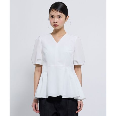 程よく丸みを持たせたパフスリーブが、女性らしい柔らかさを添え、甘さを抑えた上品な印象に仕上げました。デコルテをすっきりと見せるVネックデザインが、顔まわりにシャープさと大人の抜け感をプラス。ウエスト位置での切り替えとタックディテールにより、自然な立体感を演出。裾に向かって広がるペプラム風シルエットが、体のラインを拾いにくく、スタイルアップ効果も期待できます。シンプルなワントーンながら、構築的なシルエットが存在感を放つ一枚。きれいめなボトムと合わせた通勤スタイルから、細身パンツとのコーディネートまで、幅広く活躍するデザインブラウス。