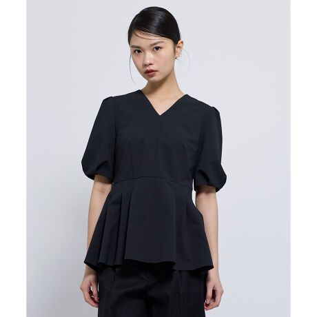 程よく丸みを持たせたパフスリーブが、女性らしい柔らかさを添え、甘さを抑えた上品な印象に仕上げました。デコルテをすっきりと見せるVネックデザインが、顔まわりにシャープさと大人の抜け感をプラス。ウエスト位置での切り替えとタックディテールにより、自然な立体感を演出。裾に向かって広がるペプラム風シルエットが、体のラインを拾いにくく、スタイルアップ効果も期待できます。シンプルなワントーンながら、構築的なシルエットが存在感を放つ一枚。きれいめなボトムと合わせた通勤スタイルから、細身パンツとのコーディネートまで、幅広く活躍するデザインブラウス。