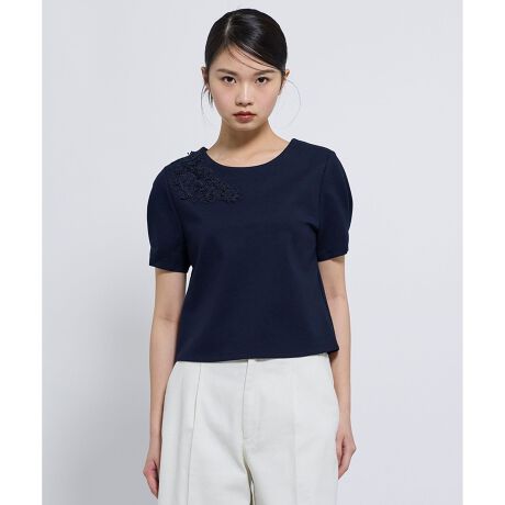 トッカオリジナルのケミカルレースを贅沢に使用した、上品さと華やかさを兼ね備えたカットソー。左肩にあしらわれた立体感のあるフラワーモチーフは、繊細なレースの表情が際立ち、同色使いながらも存在感のあるデザインに仕上げました。甘さを抑えた配置とボリューム感で、大人の女性にも取り入れやすい洗練された印象を演出します。