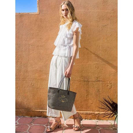 表情のある凹凸感が単調になりがちなワントーンスタイルに奥行きを与え、シンプルながらも存在感のある一本に。甘さを感じさせないクリーンなデザインのため、ブラウスやジャケットを合わせたきれいめな着こなしはもちろん、カットソーやニットと合わせた抜け感のある大人カジュアルにも好相性です。