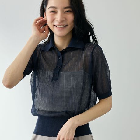 ポロカラーの端正な表情がクラシックなムードとセミシアーな編地が現代的な抜け感を両立します。