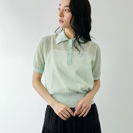 ポロカラーの端正な表情がクラシックなムードとセミシアーな編地が現代的な抜け感を両立します。