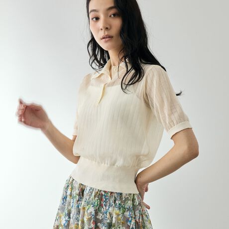 ポロカラーの端正な表情がクラシックなムードとセミシアーな編地が現代的な抜け感を両立します。