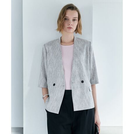 ■デザインすっきりとした印象を与える、ノーカラーデザインの半袖ジャケットです。首元の抜け感が女性らしさを引き立て、合わせるインナーを選ばず幅広いスタイリングにマッチします。軽やかな半袖仕様で、春から夏シーズンにぴったりの一枚です。きちんと感のあるシルエットながらリラックスした着心地も魅力で、オンオフ問わず活躍すること間違いなし。パンツにもスカートにも合わせやすく、羽織るだけで上品な大人スタイルを完成させてくれる万能アイテムです。