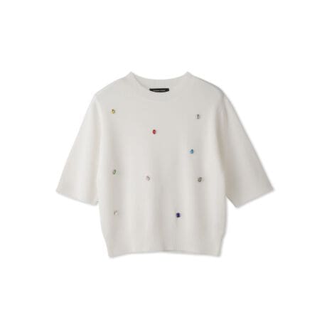 マルチカラーのビジューデザインが視線をさらうレーヨンナイロンの糸を使用したドライタッチに仕上げたサマーニット。