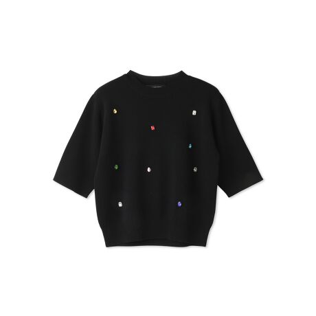 マルチカラーのビジューデザインが視線をさらうレーヨンナイロンの糸を使用したドライタッチに仕上げたサマーニット。