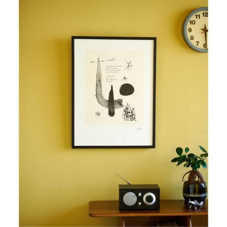 定規で引いたような直線ではなく、手描きの温かみや揺らぎを感じさせるこれらの形は、観る者の想像力を刺激するミロならではのユーモラスで生命力あふれる世界観を伝えています。