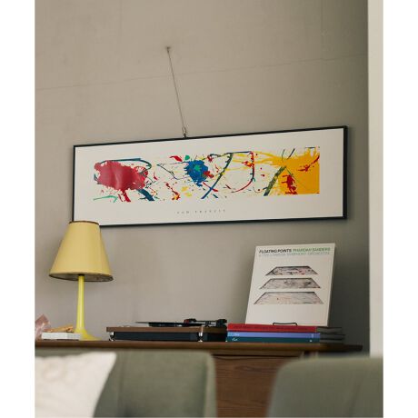 この横長の構図を持つ作品は、彼の特徴である「ドリッピング(絵具を垂らす技法)」や鮮やかな色彩の飛沫が画面全体にリズムを生み出しています。