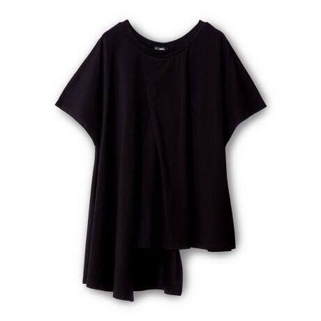 アシンメトリーに広がるフレアーシルエットが印象的なTシャツ。