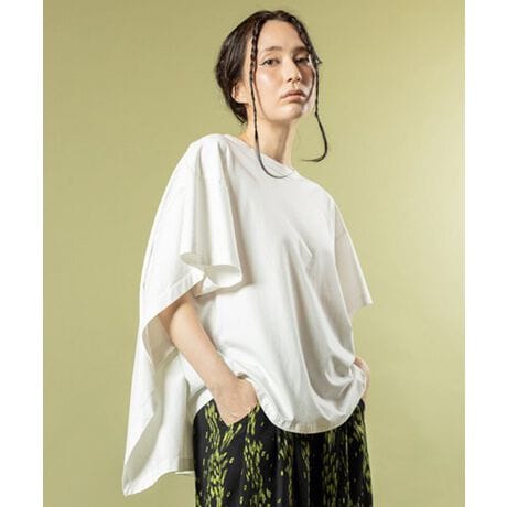 ケープのように揺れるバックレイヤードが、ミニマルなTシャツにニュアンスをプラス。