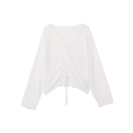 透け感とドロストで叶える、大人可愛いシアートップス軽やかなシアー素材が魅力のプルオーバーです。ほどよい透け感がコーディネートに抜け感をプラスし、やさしく女性らしい印象を演出します。フロントにはドローストリングデザインを取り入れており、リボンを絞ることでシルエットの変化を楽しめるのがポイントです。ギャザーが生まれることで自然な立体感が生まれ、シンプルながらも存在感のあるスタイルに仕上がります。すっきりとしたVネックは顔まわりをきれいに見せてくれるため、カジュアルな中にも大人らしい雰囲気を演出します。デニムやワイドパンツ、スカートなどさまざまなボトムスと相性が良く、合わせるアイテムによって幅広いスタイリングを楽しめます。軽やかで着心地もよく、日常のカジュアルコーデをやさしく華やかにしてくれる一枚です。透け感[あり]