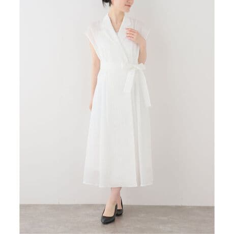 すっきりとしたVネックとウエストのリボンディテールが、女性らしいメリハリのあるシルエットを演出します。