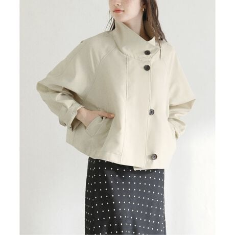 スタンドカラーのデザインがすっきりとした印象をつくり、フロントの大きめボタンが程よいアクセントに。