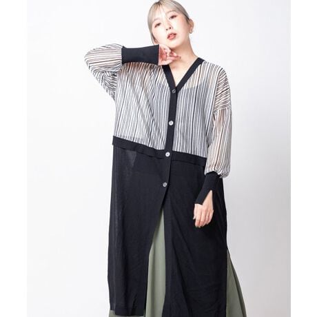 スマートなロングカーディガンは、スリットやストライプ切替がスタイルアップへ導くポイント。