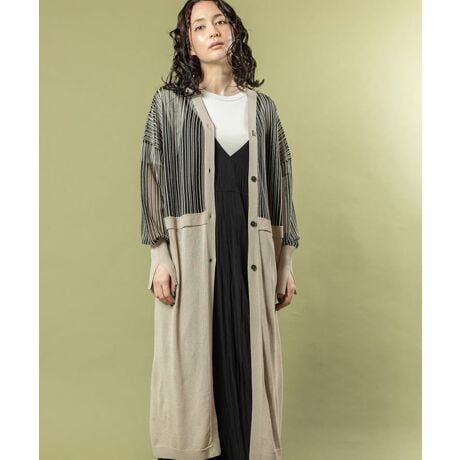 スマートなロングカーディガンは、スリットやストライプ切替がスタイルアップへ導くポイント。
