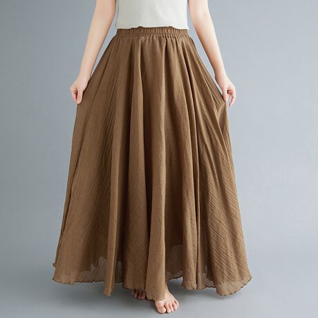 柔らかい生地にウエストゴムではき心地よく、さり気ない透け感でロングの丈でも軽やかな印象に。
