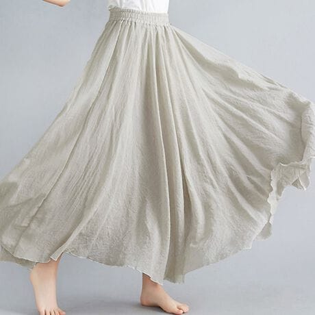 柔らかい生地にウエストゴムではき心地よく、さり気ない透け感でロングの丈でも軽やかな印象に。