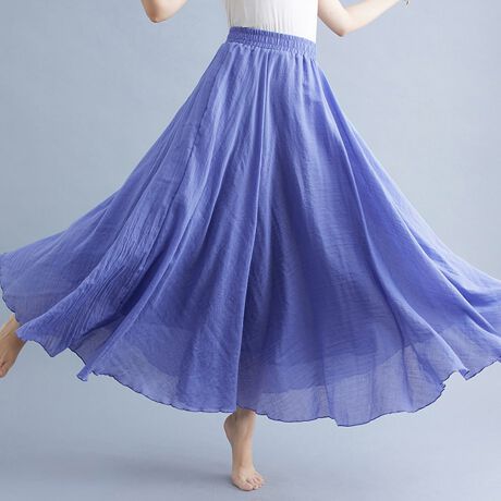 柔らかい生地にウエストゴムではき心地よく、さり気ない透け感でロングの丈でも軽やかな印象に。