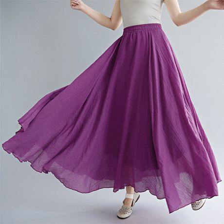 柔らかい生地にウエストゴムではき心地よく、さり気ない透け感でロングの丈でも軽やかな印象に。