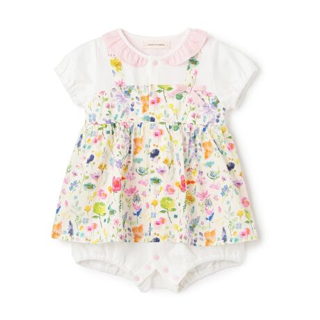 鮮やかなボタニカル柄の布帛をドッキングした個性的なロンパースです。