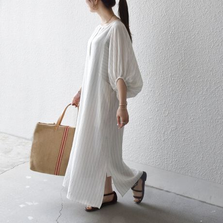フラットサンダルでカジュアルに、華奢なアクセサリーを合わせればリゾートやお出かけシーンにも活躍します。