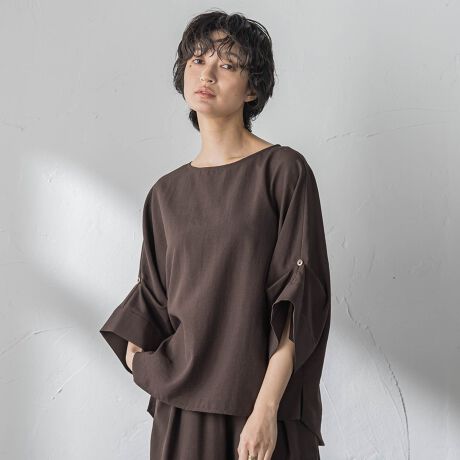 ゆるやかなドルマンシルエットが女性らしい抜け感を演出する、ボートネックブラウス。