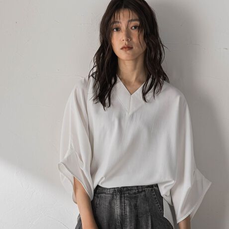 シンプルながら、一枚でサマになるブラウス。