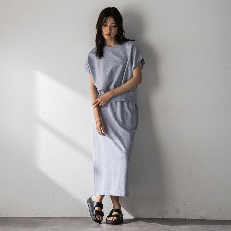 トップスはゆとりのあるシルエットながら、前後差をつけたカーブヘムが軽やかなバランス。
