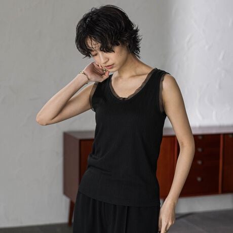 チュールを重ねたカーヴィなVネックのリブタンクトップ。