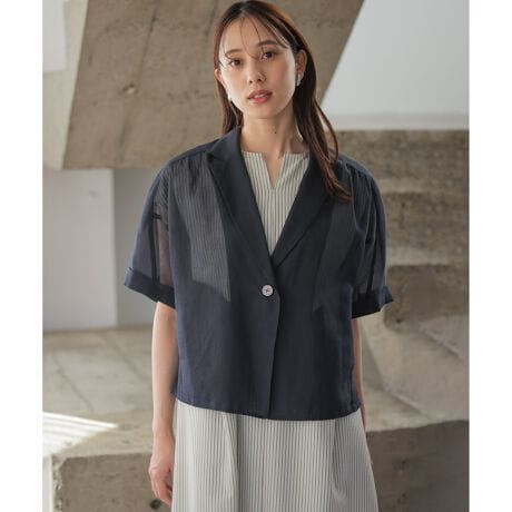 ■デザイン・.シアーなドロップドショルダーのふんわりとしたギャザーからゆったりしたシルエットの5分袖のテーラードジャケット。・ジレ感覚で夏のマンネリ化しがちなスタイリングに鮮度をくれるアイテムです。・シームを利用した両サイドのポケットはスマホがスッポリと入ります。・貝ボタンで高級感と軽さをだしました。