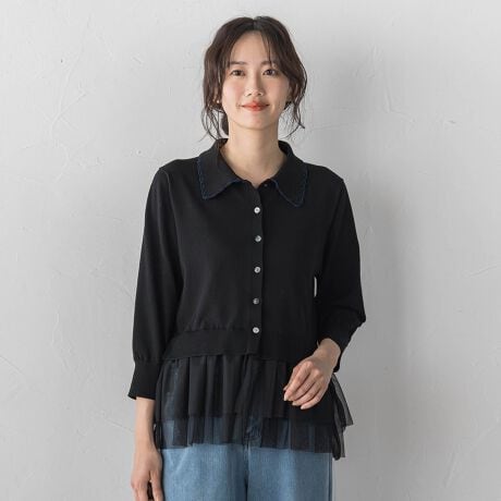 裾チュールドッキングポロ襟ニット