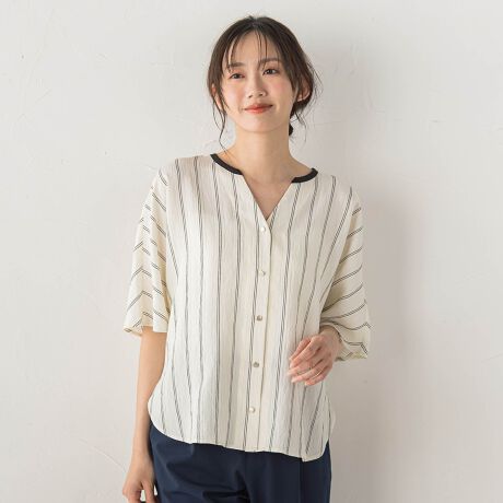 バックディティールもポイントのこれからのシーズンに着回しやすい前あきのキーネックブラウスです。