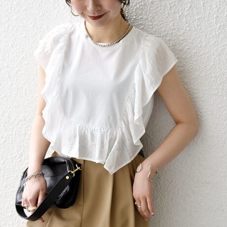 フリルがフレンチスリーブのように気になる二の腕をふんわり隠してくれます。