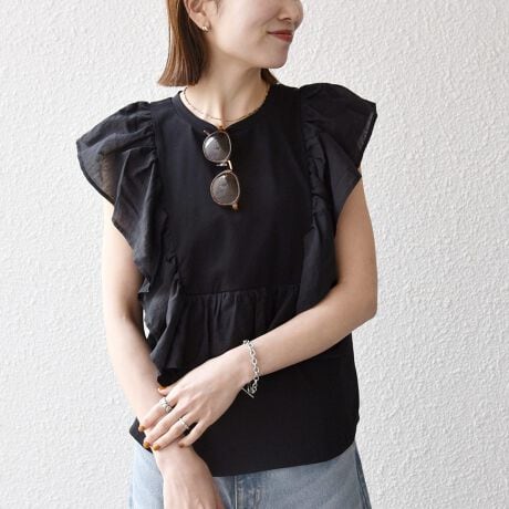 肩から袖、身頃にドッキングした、異素材のフレアデザインがポイントのノースリTシャツ。