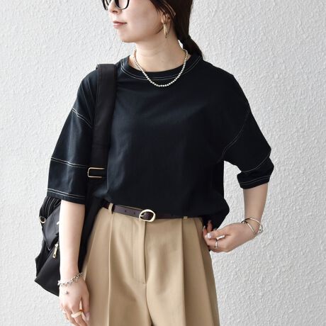 配色ステッチが目を惹くハーフスリーブプルオーバー。