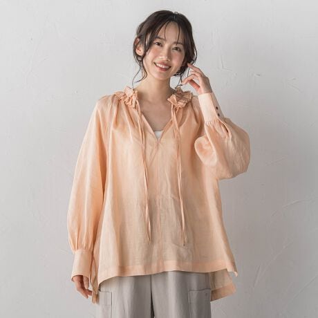 華やぎのある襟元のフリルと、程よくフレアに広がるシルエットが軽やかなラミーブラウス。