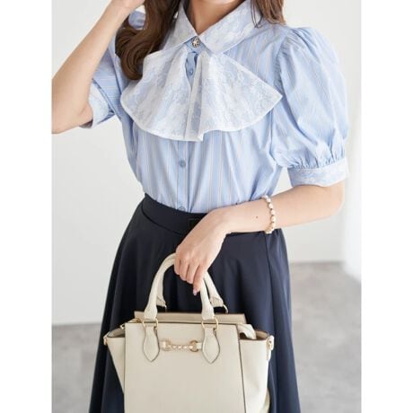 [型番:26550732190]レースを重ねたボウタイデザインが目を引くブラウス。程よくゆとりのあるシルエットで、オンオフ問わず取り入れやすい一枚です。テーパードパンツやセンタープレスパンツを合わせるとバランスよくまとまり、タイトスカートと合わせるときれいめな印象に仕上がります。モデル(B柄着用)身長:165cmMサイズ着用