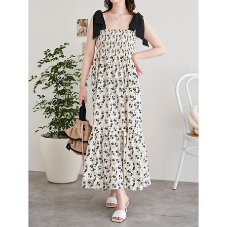 [型番:26550726408]小花柄のデザインがシーズンムードを高めるキャミワンピース。肩紐部分はリボンになっており、ガーリーな印象をプラスします。シャーリング切り替えが心地よいフィット感を演出。休日のお出かけシーンに大活躍するアイテムです。モデル(B柄/A柄着用)身長:160cmMサイズ着用