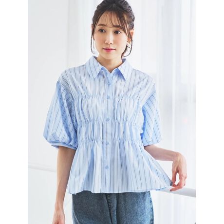 [型番:26550726234]ふんわりとしたスリーブのデザインが可愛らしさを演出するブラウス。くしゅっとしたギャザーを寄せ、表情感をプラスしています。細やかなストライプ柄が爽やかな印象を与えます。パンツと合わせたきれいめな装いがおすすめです。モデル(サックス着用)身長:165cmMサイズ着用