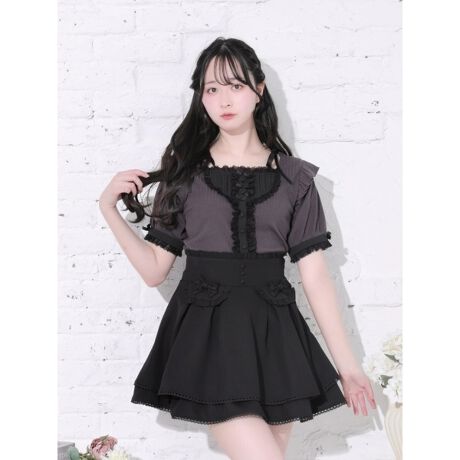 胸元のリボンディテールやストラップがアクセントになり、甘さの中にほどよいエッジをプラスします。