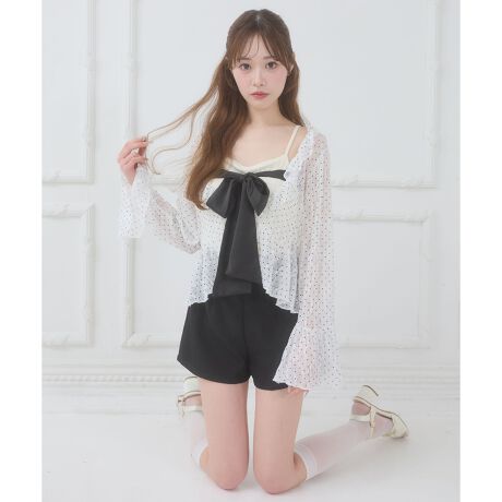 シアーシャツや薄手のカーディガンを羽織り、フロントのリボンを見せるスタイリングがおすすめです。
