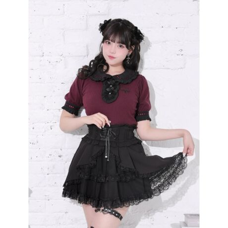 配色のハシゴレースとフリル襟が目を惹く、存在感のあるカットソー。