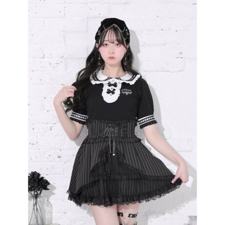 配色のハシゴレースとフリル襟が目を惹く、存在感のあるカットソー。