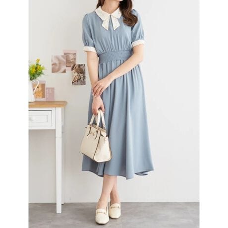 [型番:26550732744]レース使いの衿がポイントの上品な印象のワンピース。ウエストのシャーリングが自然にメリハリをつけ、すっきりとしたシルエットに仕上げています。パンプスやフラットシューズを合わせるときれいめにまとまり、スニーカーを合わせると程よくカジュアルダウンできますモデル(青着用)身長:165cmMサイズ着用